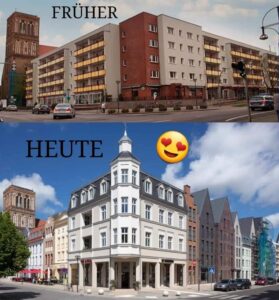 Myndigheterna hade ursprungligen planerat att stadens historiska centrum skulle återuppbyggas med modernistiska höghus. Ekonomiska svårigheter förhindrade dock förverkligandet av dessa planer. Två kyrkor återuppbyggdes och de kvarvarande ruinerna i centrum av den gamla staden revs på 1960-talet. Men nu är det alltså återuppbyggt. I vissa fall har man till och med använd gamla husgrunder och tegelstenar från platsen.